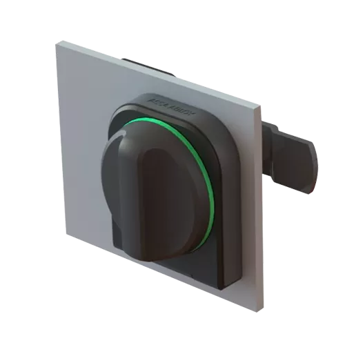 Fleksibel adgangskontrol med motorvrider til branddøre. Åbnes med brik, kort, armbånd eller software – eksisterende nøgle kan stadig bruges.Udendørs adgangskontrol