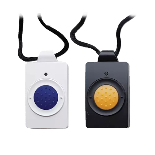 Denne bærbare alarm kan bruges som enten alarmtryk til borgere eller overfaldsalarm til personale, afhængigt af behov og opsætning. Enheden kan anvendes som armbånd, halssmykke eller som klips der sættes fast i tøjet.s – og passer til både plejehjem, bosteder og institutioner.